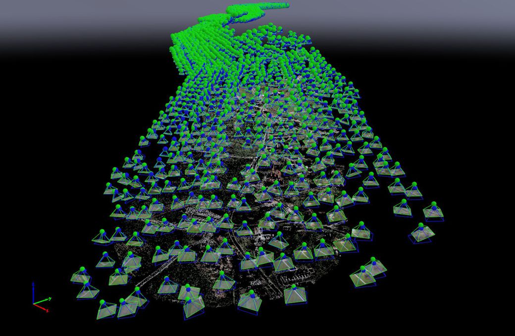 Za georeferenciranje rastrskih aerofotografij smo uporabili 36 oslonilnih točk, katerih koordinate smo pridobili z GNSS-izmero. Aerofotografije smo s postopki georeferenciranja pravilno orientirali in jih umestili v državni prostorski koordinatni sistem. Stereopare aerofotografij smo obdelali s fotogrametričnimi postopki slikovnega ujemanja, izdelali oblak 3D točk (point cloud) in zatem še digitalni model površja (DMP) kot rastrski in metričen 3D model površja opazovanega območja. Vse to smo uporabili za izdelavo ravninskega ortofoto načrta, boljše kakovosti in višje ločljivosti od starih materialov. Stari ortofoto načrt iz leta 2014 ima namreč 25 cm, medtem ko ima novi ortofoto ločljivost 3 cm/px.