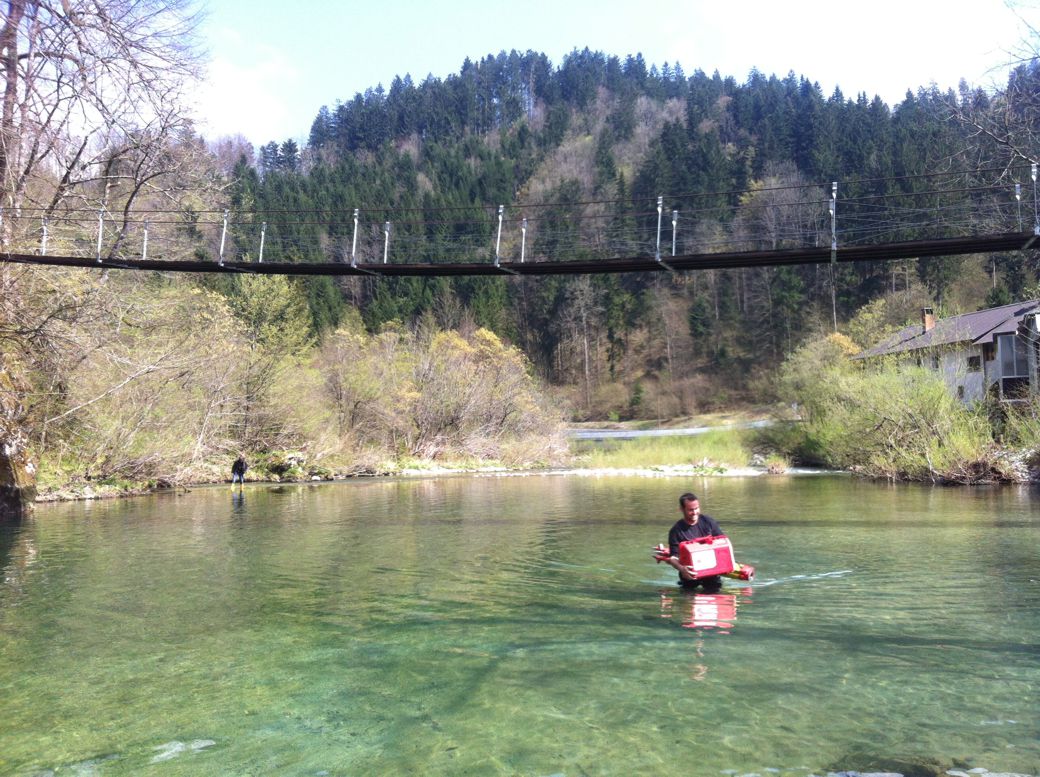 V kratkem času je ekipa LGB-jevih inženirjev izmerila kar 56 vodotokov po Sloveniji. Strokovni del naloge tokrat ni predstavljal največjega izziva: zelo težavna in zato toliko bolj skrbno pripravljena je bila izvedba meritev, saj je bilo potrebno zagotoviti ustrezno visoko raven varstva pri delu. Poleg izvajanja meritev na kopnem smo merili tudi prečne profile strug vodotokov – to pa pomeni delo v mrzli in deroči vodi. Obvezno opremo geodetskega strokovnjaka so pri tem projektu dopolnile neoprenske obleke in vrvi za varovanje.